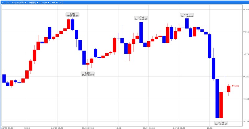 メキシコペソですが、4/8週は9.229円付近からスタートして、一時9.343円まで上げますが、9.1円台から9.3円台の上下動を繰り返して9.208円付近で終えた展開でした。