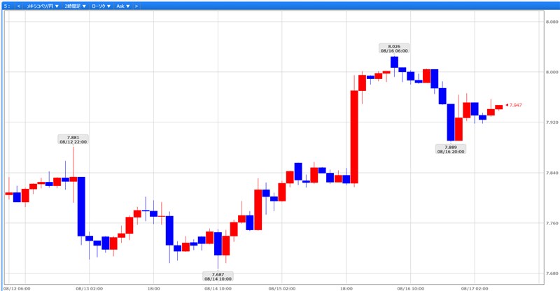 メキシコペソですが、8/12週は7.783円付近からスタートし、7.687円まで下げますが、一気に回復を見せ8.026円まで上昇。
