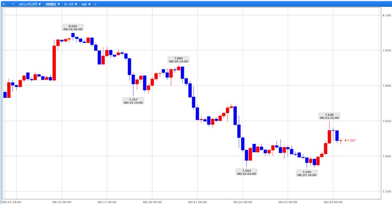 メキシコペソですが、8/19週は7.904円付近からスタートし、いったん8.026円まで上げますが、そこから7.449円まで下落。