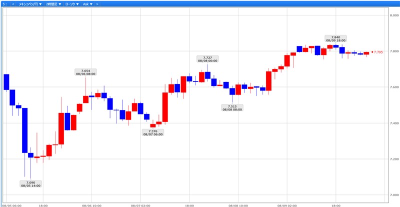 メキシコペソですが、8/5週は7.639円付近からスタートし、いったん7.090円まで下げますが、こそからじわりと回復。