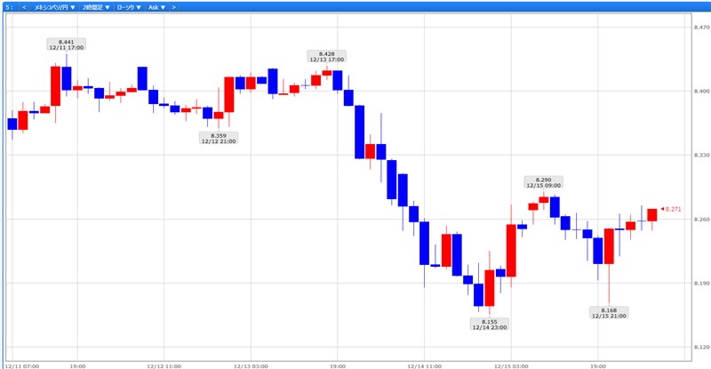 メキシコペソですが、2023年12月11日週は8.441円から8.155円へ徐々に下がっていき、8.1円台から8.2円台の間を上下しておりました。