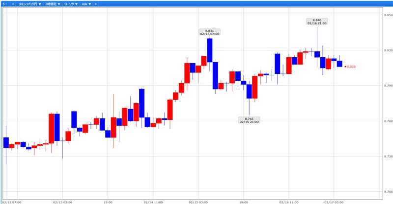 メキシコペソですが、2/12週は8.734円付近からスタートしてじわりじわりと上げていき、あっという間に8.8円台を突破。