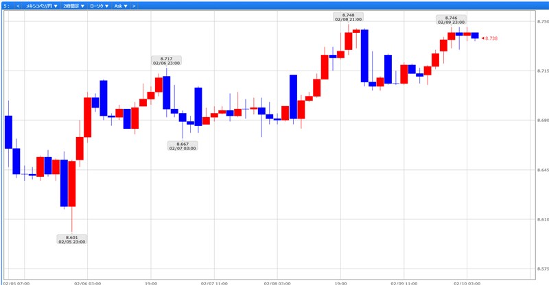 メキシコペソですが、2/5週は8.680円付近からスタートし、8.601円までいったん下げましたが、8.748円まで上げて8.738円となる展開でした。