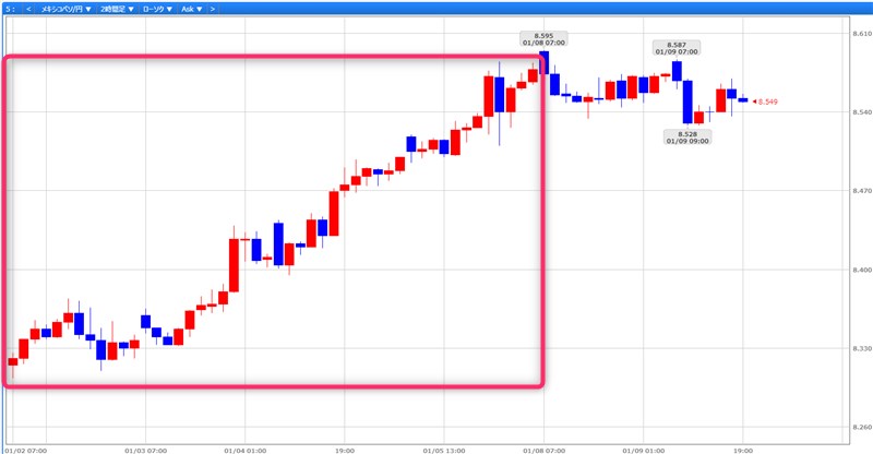 メキシコペソですが、2024年最初の1/1週は8.275円からスタートし、8.575円へほぼ真っすぐに右肩上がりの展開でした。