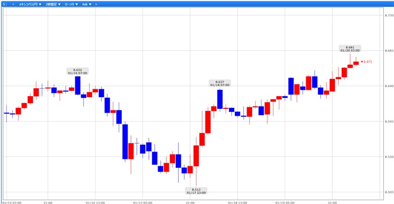 メキシコペソですが、1/15週は8.595円からスタートし、8.652円へ上げますが8.513円まで下げ、そこから8.681円までじわじわと上げる展開でした。