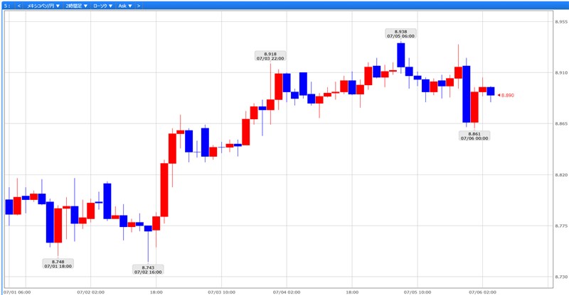 メキシコペソですが、7/1週は8.773円付近からスタートし、いったん8.743円まで下げますが、そこから急上昇して8.938円まで上げました。