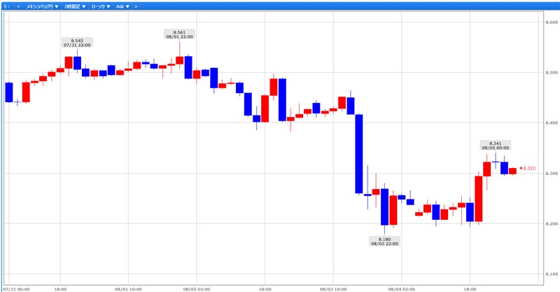 メキシコペソですが、8.561円から一時8.180円まで急降下して、8.3円台まで戻ってきましたね。