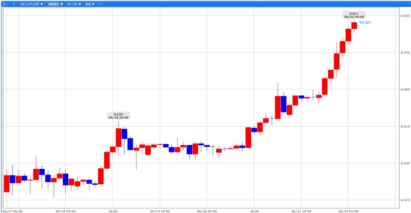 メキシコペソですが、6/17週は8.517円付近からスタートし、8.811円まで一気に登り上がる一方的な上げ相場の展開でした。