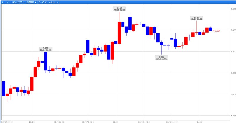 メキシコペソですが、3/25週は9.031円付近からスタートして、9.165円までじりじりと上げ、9.134円で終えた展開でした。