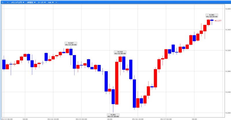 メキシコペソですが、5/13週は9.282円付近からスタートして、9.327円まで上げると9.201円へ一気に急降下。