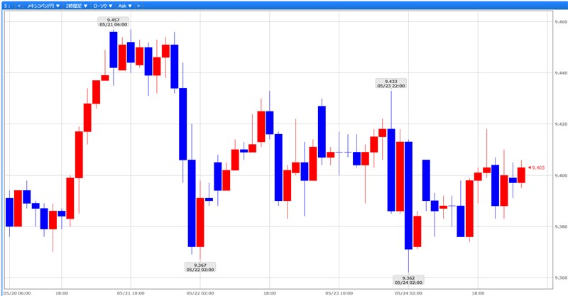 メキシコペソですが、5/20週は9.362円付近からスタートして、なんと9.457円まで上昇。