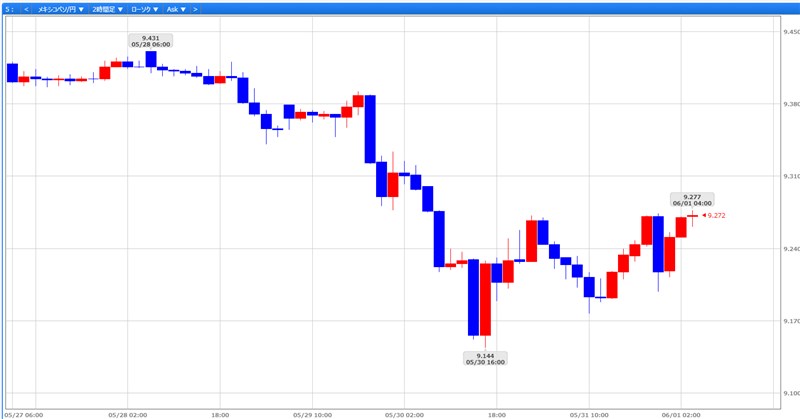 メキシコペソですが、5/27週は9.408円付近からスタートしてから、じりじりと9.144円まで下げていき、9.272円で終えた展開でした。