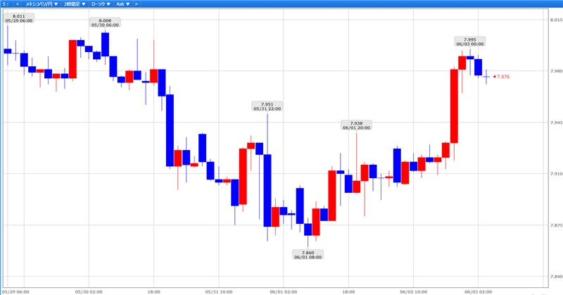 メキシコペソはいったん下げましたが、また8円付近まで戻っきてきましたね。