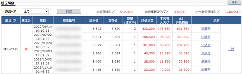 最近は、SBI証券よりもスワップポイントが高いヒロセ通商でもメキシコペソを運用し始めました。