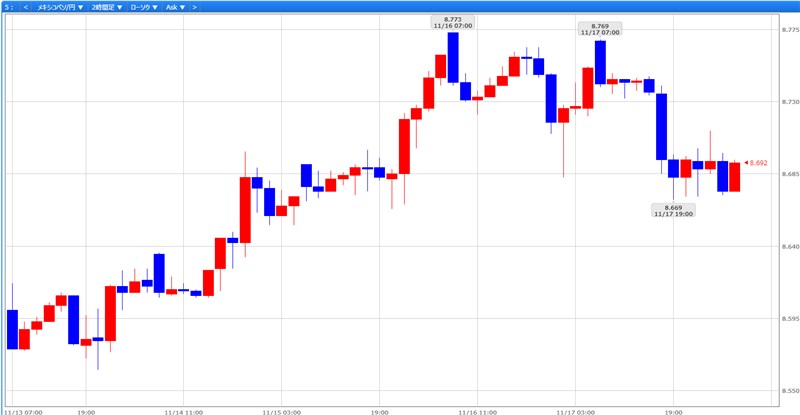 メキシコペソですが、2023年11月13日週は8.576円付近から始まり、8.773円までじわじわと上げて、いったん8.669円まで下げるという展開でした。