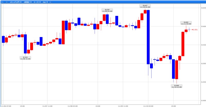 メキシコペソですが、2023年11月6日週は8.550円付近から8.647円までじわじわと上げて、いったん8.466円まで下げました。