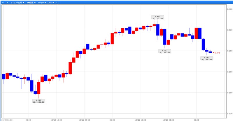 メキシコペソですが、2023年10月9日週は8.077円まで下げ、8円を割りそうでしたが8.411円まで回復してちょっとだけ戻してきた展開でした。