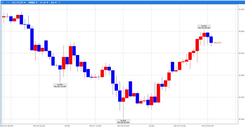 メキシコペソですが、今週は8.643円から8.402円まで下げて8.603円まで戻して来ている展開でした。