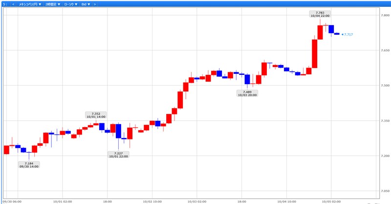 メキシコペソですが、9/30週は7.208円付近からスタートし、今週は上げ上げ相場で7.783円付近まで駆け上り、7.712円で終える展開でした。